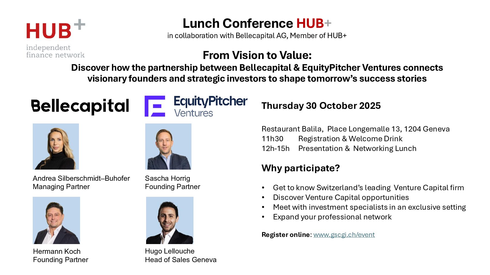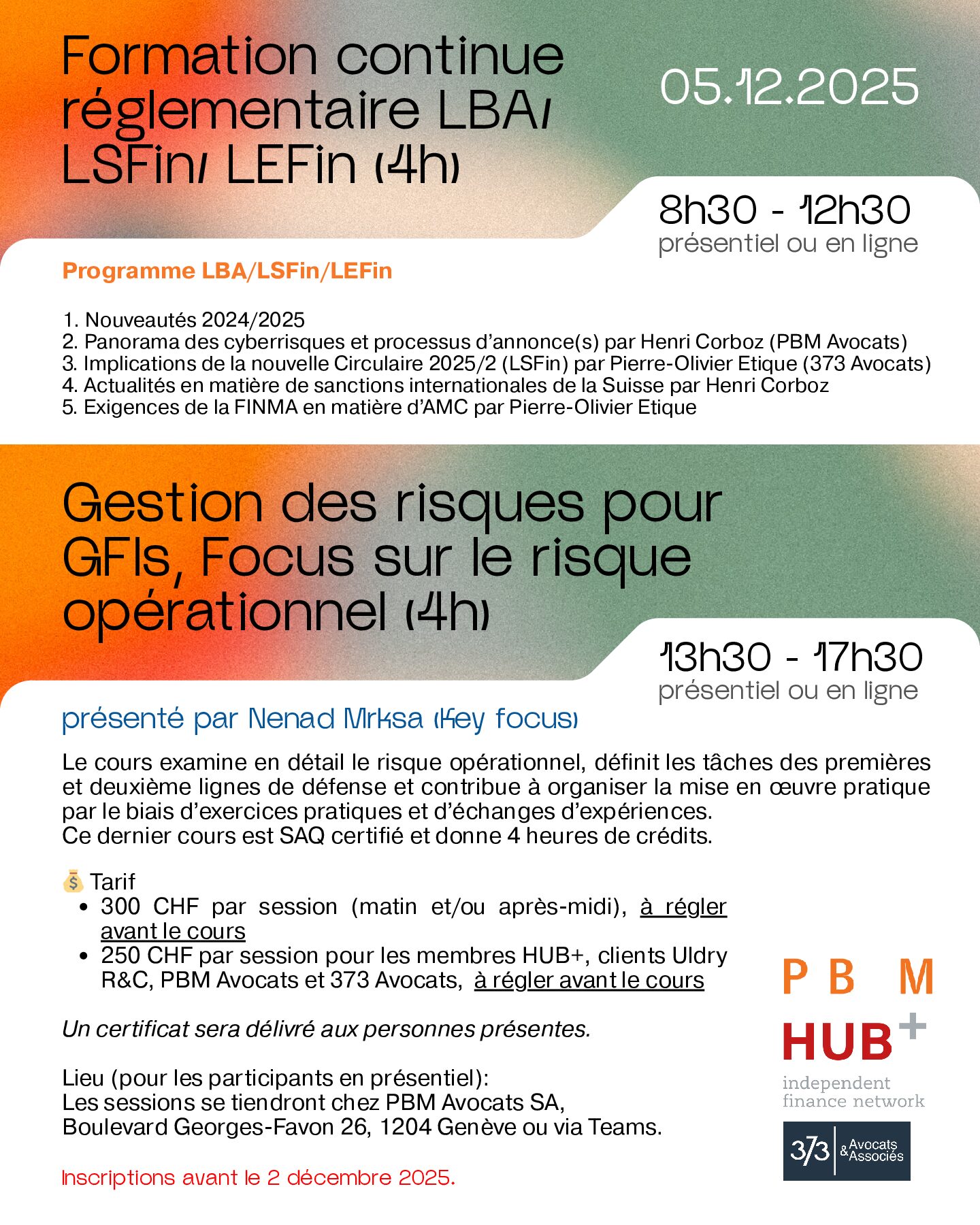 HUB+ offre aux indépendants de la finance en Suisse un accompagnement complet incluant networking, soutien juridique et administratif, ainsi qu’un accès à des conférences et formations de haut niveau. Grâce à sa plateforme indépendante et innovante, HUB+ facilite le développement professionnel et la visibilité de ses membres dans un écosystème dynamique et collaboratif.