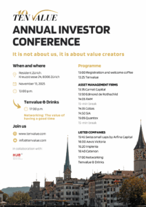 We are delighted to invite you to the Tenvalue Annual Investor Conference in Zurich, in collaboration with HUB+. Tenvalue is member of HUB+.
