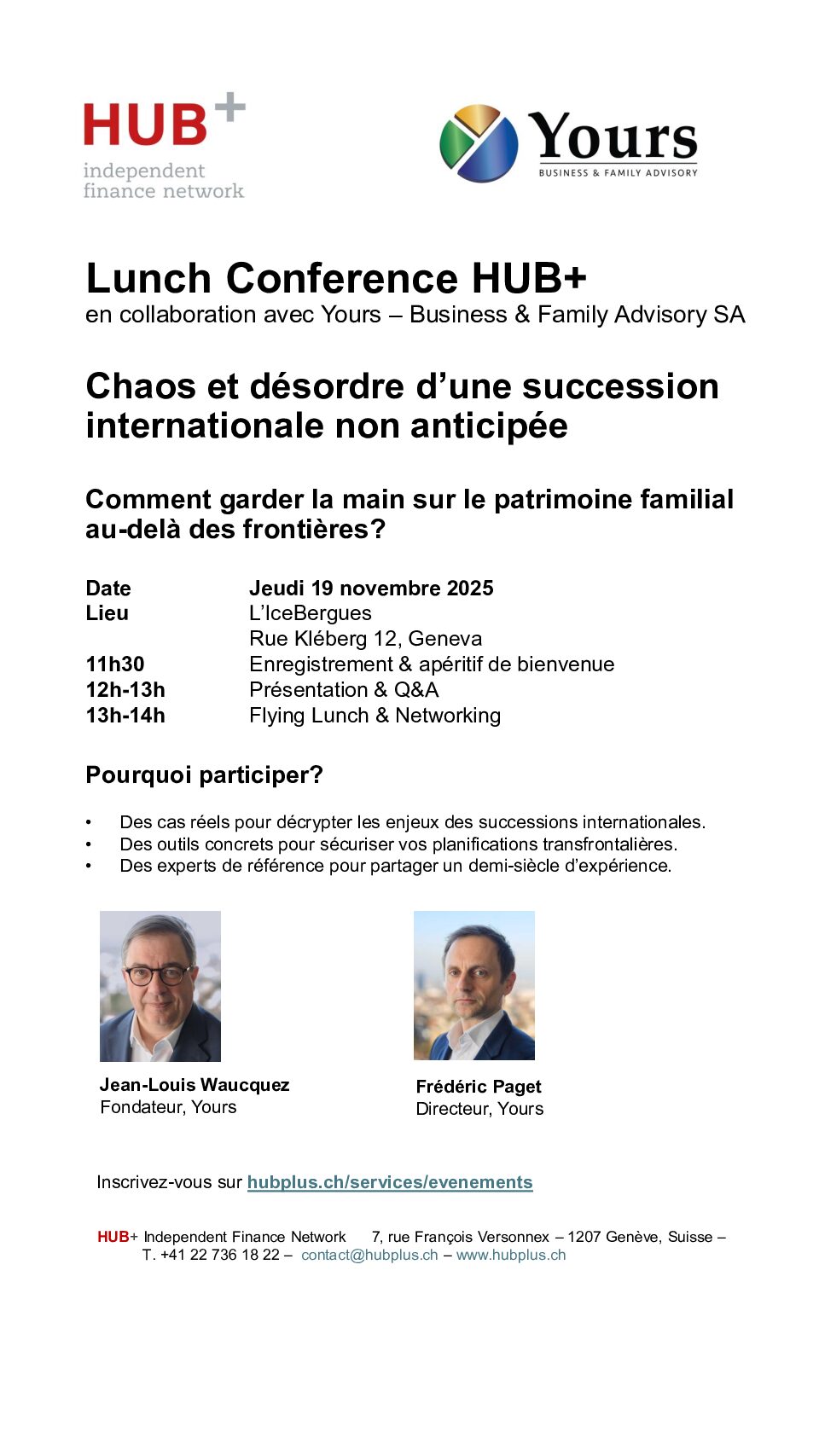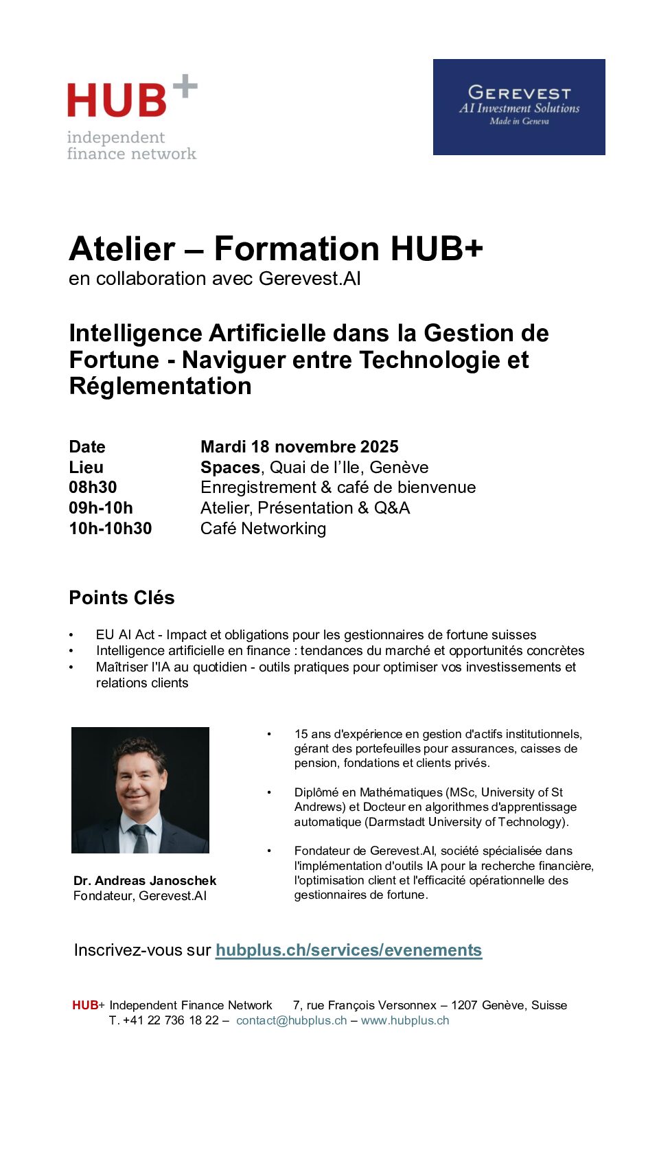 Fidèle à sa mission de soutien aux indépendants de la finance en Suisse, Hub+ organise régulièrement des événements conçus pour informer, connecter et inspirer. Conférences, formations ou rencontres thématiques : chaque rendez-vous est une opportunité de renforcer vos compétences, élargir votre réseau et contribuer à un écosystème entrepreneurial solide, humain et innovant.
